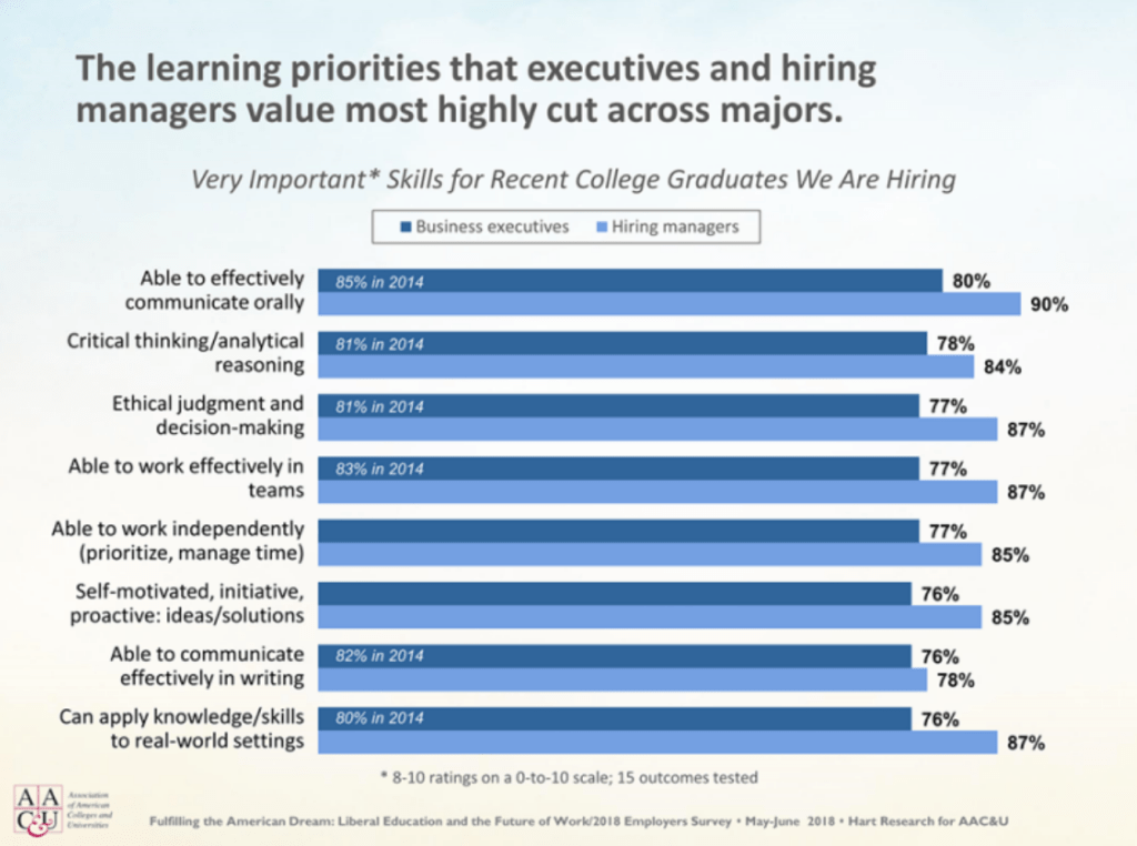 Oral communication is always at the top of the list of skills employers want. The 90% of hiring managers who say that speaking is a very important skill (see chart) aren’t looking for public speakers. They want employees who are generally well spoken. Yes, some jobs involve occasional presentations, but all jobs involve talking. Whether collaborating with co-workers, attending to customers, or fielding client calls, effective speakers are in demand. If we look at oral communication the way the business world does, we realize that speaking is an incredibly important language art for professional success. To conflate “speaking” with “public speaking” causes us to seriously undervalue the need to teach verbal communication skills. It allows us to pretend that speaking will not be important in the lives of most students: few will be public speakers so why teach speaking?